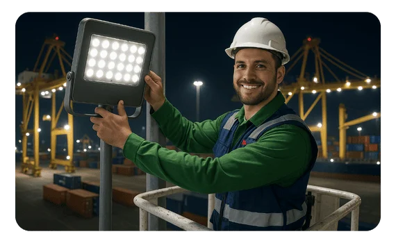 Ofrecemos soluciones de iluminación robustas para puertos y centros logísticos, garantizando seguridad, eficiencia y operaciones continuas de día y de noche.