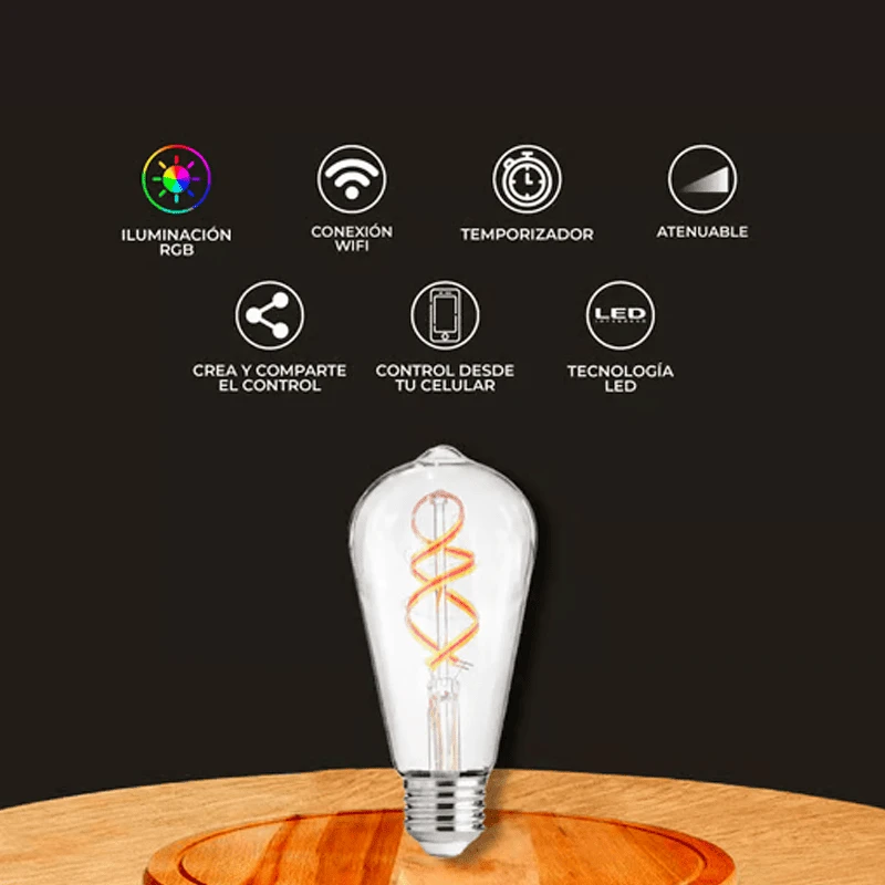 El Foco Inteligente BULB SMART RGB combina estilo vintage tipo Edison con tecnología moderna, ofreciendo luz RGB y luz cálida suave de 2700 K. Su filamento LED integrado de 4 W permite hasta un 90% de ahorro energético y se adapta a bases E27 tradicionales.